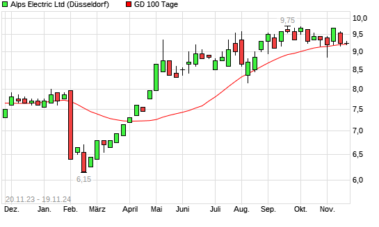 Mit dem Anstieg auf 9,30 EUR hat die Alps Electric-Aktie am 18.11.2024 die 100-Tage-Linie nach oben gekreuzt.