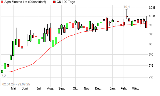 Mit dem Rücksetzer auf 9,55 EUR hat die Alps Electric-Aktie am 28.03.2025 die 100-Tage-Linie nach unten gekreuzt.