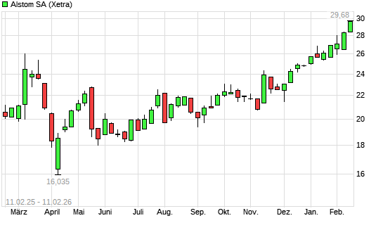 Mit dem Anstieg auf 28,74 EUR hat die Alstom-Aktie (ISIN FR0010220475) am 10.02.2026 ein neues 3-Jahres-Hoch erreicht und damit den Kurs vom 09.02.2026 eingestellt.