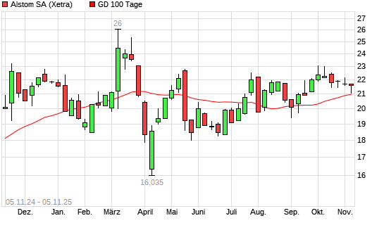Mit dem Rücksetzer auf 20,81 EUR hat die Alstom-Aktie am 04.11.2025 die 100-Tage-Linie nach unten gekreuzt.