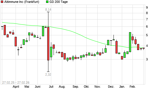 Mit dem Anstieg auf 3,80 EUR hat die Altimmune-Aktie am 26.02.2026 die 200-Tage-Linie nach oben gekreuzt.