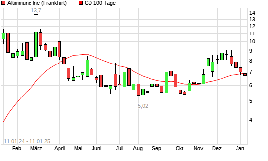 Mit dem Rücksetzer auf 6,73 EUR hat die Altimmune-Aktie am 10.01.2025 die 100-Tage-Linie nach unten gekreuzt.