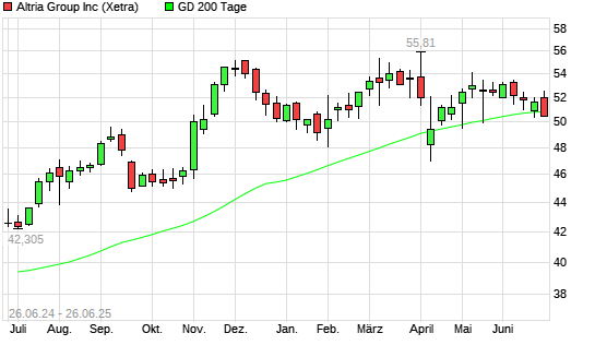 Mit dem Rücksetzer auf 50,82 EUR hat die Altria-Aktie am 25.06.2025 die 200-Tage-Linie nach unten gekreuzt.Die Altria-Aktie befand sich seit dem 17.06.2025 im langfristigen Aufwärtstrend ...weiterlesen