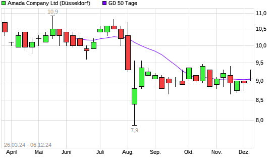 Mit dem Anstieg auf 9,05 EUR hat die Amada-Aktie am 05.12.2024 die 50-Tage-Linie nach oben gekreuzt.