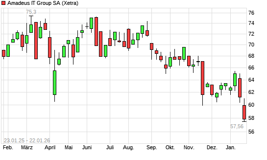 Mit dem Rücksetzer auf 58,02 EUR hat die Amadeus IT-Aktie (ISIN ES0109067019) am 21.01.2026 ein neues 12-Monats-Tief erreicht und damit den Kurs vom 20.01.2026 eingestellt.