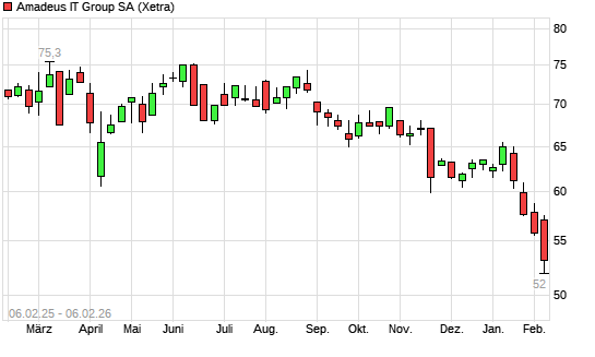 Mit dem Rücksetzer auf 53,56 EUR hat die Amadeus IT-Aktie (ISIN ES0109067019) am 05.02.2026 ein neues 12-Monats-Tief erreicht und damit den Kurs vom 04.02.2026 eingestellt.