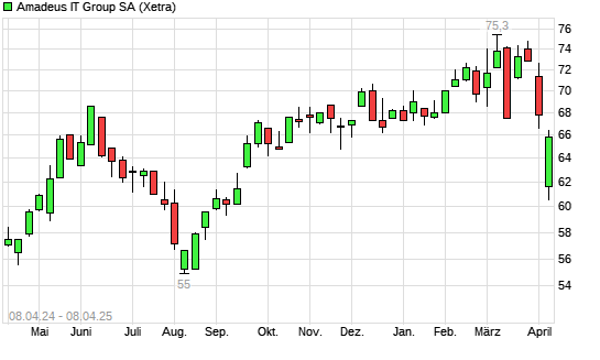 Mit dem Rücksetzer auf 64,12 EUR hat die Amadeus IT-Aktie (ISIN ES0109067019) am 07.04.2025 ein neues 6-Monats-Tief erreicht und damit den Kurs vom 08.10.2024 eingestellt.