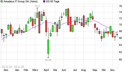 Mit dem Rücksetzer auf 67,00 EUR hat die Amadeus IT-Aktie am 14.11.2025 die 50-Tage-Linie nach unten gekreuzt.