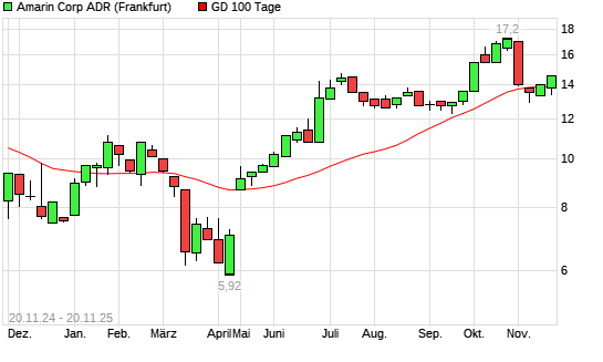 Mit dem Anstieg auf 14,20 EUR hat die Amarin Corporation-Aktie am 19.11.2025 die 100-Tage-Linie nach oben gekreuzt.