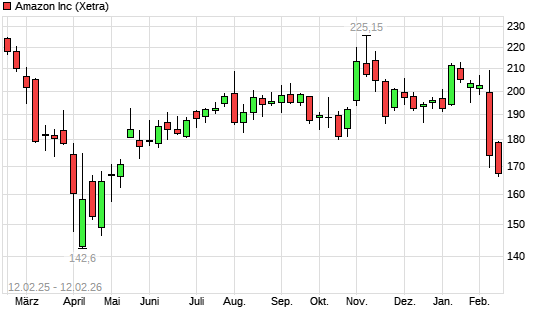 Mit dem Rücksetzer auf 172,02 EUR hat die Amazon-Aktie (ISIN US0231351067) am 11.02.2026 ein neues 6-Monats-Tief erreicht und damit den Kurs vom 10.02.2026 eingestellt.