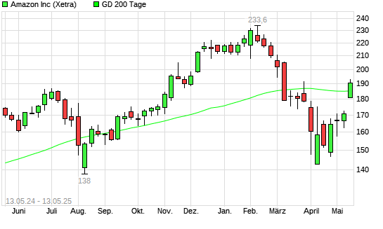 Mit dem Anstieg auf 187,98 EUR hat die Amazon-Aktie am 12.05.2025 die 200-Tage-Linie nach oben gekreuzt.