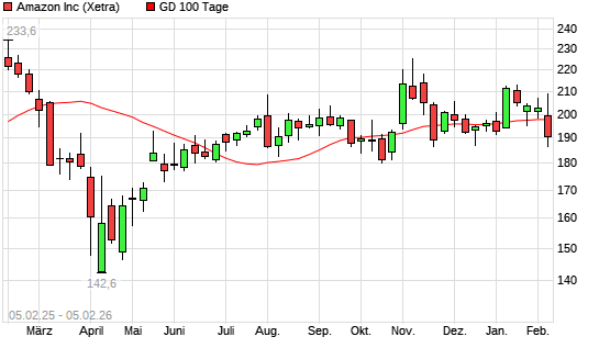 Mit dem Rücksetzer auf 197,20 EUR hat die Amazon-Aktie am 04.02.2026 die 100-Tage-Linie nach unten gekreuzt.