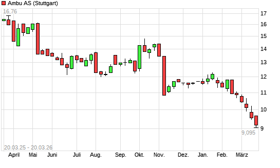 Mit dem Rücksetzer auf 9,07 EUR hat die Ambu A/S-Aktie (ISIN DK0060946788) am 19.03.2026 ein neues 12-Monats-Tief erreicht und damit den Kurs vom 17.03.2026 eingestellt.