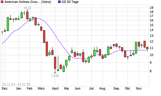 Mit dem Anstieg auf 10,79 EUR hat die American Airlines-Aktie am 20.11.2025 die 50-Tage-Linie nach oben gekreuzt.