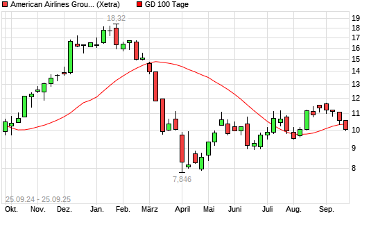 Mit dem Rücksetzer auf 10,27 EUR hat die American Airlines-Aktie am 24.09.2025 die 100-Tage-Linie nach unten gekreuzt.