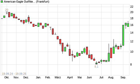 Mit dem Anstieg auf 17,00 EUR hat die American Eagle Outfitters-Aktie (ISIN US02553E1064) am 18.09.2025 ein neues 6-Monats-Hoch erreicht und damit den Kurs vom 17.09.2025 eingestellt.