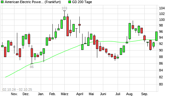 Mit dem Anstieg auf 96,00 EUR hat die American Electric Power-Aktie am 01.10.2025 die 200-Tage-Linie nach oben gekreuzt.