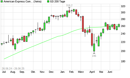 Mit dem Rücksetzer auf 264,25 EUR hat die American Express-Aktie am 25.06.2025 die 200-Tage-Linie nach unten gekreuzt.