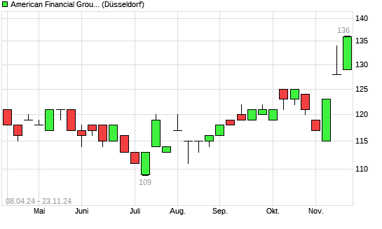 Mit dem Anstieg auf 137,00 EUR hat die American Financial Group-Aktie (ISIN US0259321042) am 22.11.2024 ein neues 12-Monats-Hoch erreicht und damit den Kurs vom 14.11.2024 eingestellt.