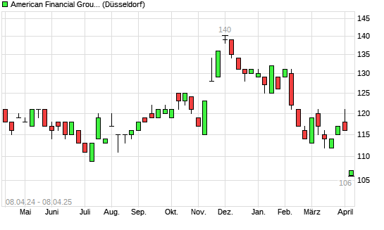 Mit dem Rücksetzer auf 107,00 EUR hat die American Financial Group-Aktie (ISIN US0259321042) am 07.04.2025 ein neues 12-Monats-Tief erreicht und damit den Kurs vom 08.07.2024 eingestellt.