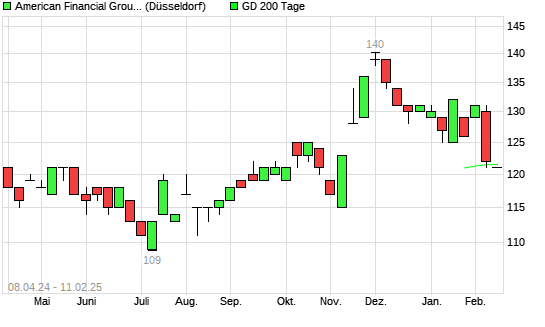 Mit dem Rücksetzer auf 122,00 EUR hat die American Financial Group-Aktie am 10.02.2025 die 200-Tage-Linie nach unten gekreuzt.