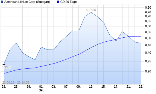 Mit dem Rücksetzer auf 0,47 EUR hat die American Lithium-Aktie am 22.10.2025 die 20-Tage-Linie nach unten gekreuzt.