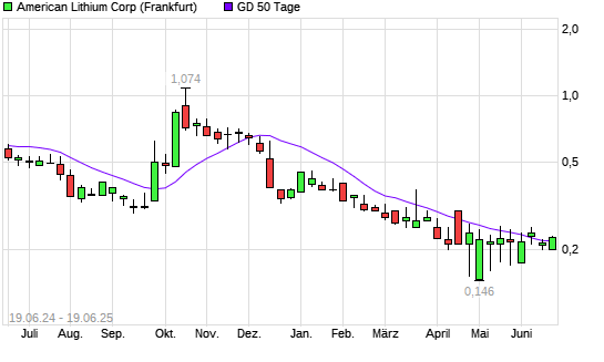 Mit dem Rücksetzer auf 0,21 EUR hat die American Lithium-Aktie am 18.06.2025 die 50-Tage-Linie nach unten gekreuzt.