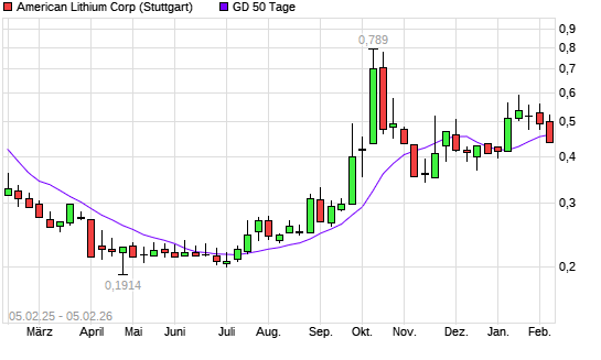 Mit dem Rücksetzer auf 0,46 EUR hat die American Lithium-Aktie am 04.02.2026 die 50-Tage-Linie nach unten gekreuzt.