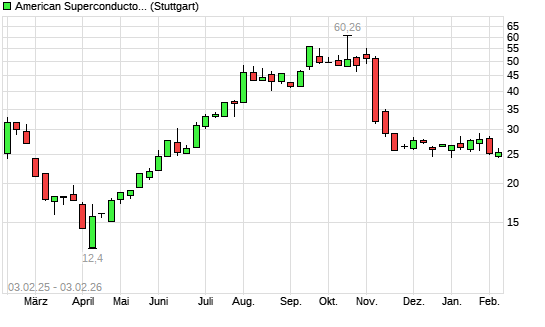 Mit dem Rücksetzer auf 24,32 EUR hat die American Superconductor-Aktie (ISIN US0301112076) am 02.02.2026 ein neues 6-Monats-Tief erreicht und damit den Kurs vom 02.01.2026 eingestellt.