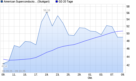 Mit dem Rücksetzer auf 48,66 EUR hat die American Superconductor-Aktie am 08.10.2025 die 20-Tage-Linie nach unten gekreuzt.