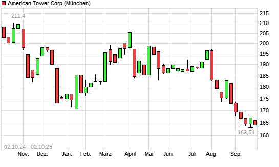 Mit dem Rücksetzer auf 162,16 EUR hat die American Tower-Aktie (ISIN US03027X1000) am 01.10.2025 ein neues 12-Monats-Tief erreicht und damit den Kurs vom 16.09.2025 eingestellt.