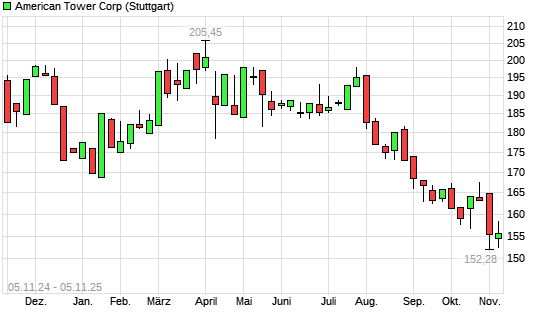 Mit dem Rücksetzer auf 152,20 EUR hat die American Tower-Aktie (ISIN US03027X1000) am 04.11.2025 ein neues 12-Monats-Tief erreicht und damit den Kurs vom 30.10.2025 eingestellt.