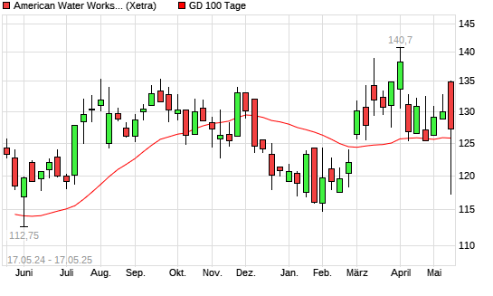 Mit dem Anstieg auf 126,60 EUR hat die American Water Works-Aktie am 16.05.2025 die 100-Tage-Linie nach oben gekreuzt.