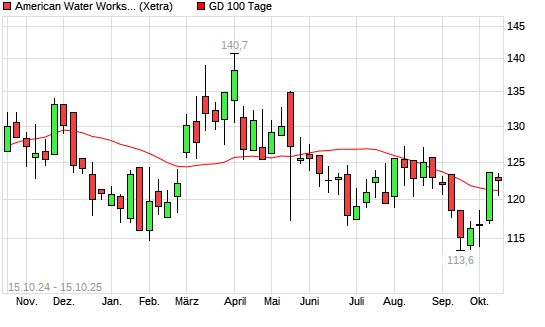 Mit dem Rücksetzer auf 120,35 EUR hat die American Water Works-Aktie am 14.10.2025 die 100-Tage-Linie nach unten gekreuzt.