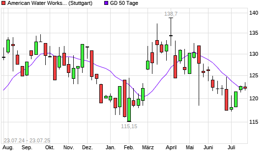 Mit dem Rücksetzer auf 121,85 EUR hat die American Water Works-Aktie am 22.07.2025 die 50-Tage-Linie nach unten gekreuzt.