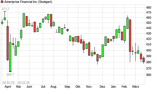 Mit dem Rücksetzer auf 378,10 EUR hat die Ameriprise Financial-Aktie (ISIN US03076C1062) am 17.03.2026 ein neues 12-Monats-Tief erreicht und damit den Kurs vom 17.11.2025 eingestellt.