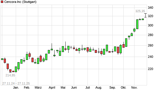 Mit dem Anstieg auf 327,10 EUR hat die AmerisourceBergen-Aktie (ISIN US03073E1055) am 26.11.2025 ein neues All-Time-High erreicht und damit den Kurs vom 25.11.2025 eingestellt.