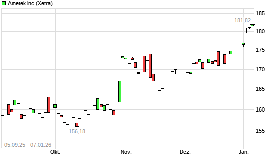 Mit dem Anstieg auf 183,10 EUR hat die Ametek-Aktie (ISIN US0311001004) am 06.01.2026 ein neues 12-Monats-Hoch erreicht und damit den Kurs vom 24.01.2025 eingestellt.
