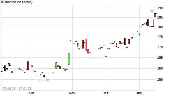 Mit dem Anstieg auf 185,50 EUR hat die Ametek-Aktie (ISIN US0311001004) am 16.01.2026 ein neues 12-Monats-Hoch erreicht und damit den Kurs vom 15.01.2026 eingestellt.