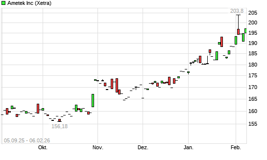 Mit dem Anstieg auf 194,16 EUR hat die Ametek-Aktie (ISIN US0311001004) am 05.02.2026 ein neues All-Time-High erreicht und damit den Kurs vom 03.02.2026 eingestellt.