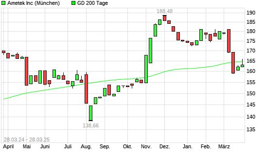 Mit dem Rücksetzer auf 163,72 EUR hat die Ametek-Aktie am 27.03.2025 die 200-Tage-Linie nach unten gekreuzt.