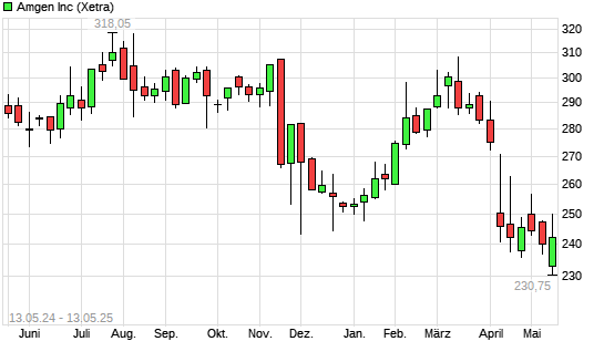 Mit dem Rücksetzer auf 230,30 EUR hat die Amgen-Aktie (ISIN US0311621009) am 12.05.2025 ein neues 12-Monats-Tief erreicht und damit den Kurs vom 22.04.2025 eingestellt.