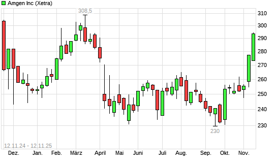 Mit dem Anstieg auf 285,00 EUR hat die Amgen-Aktie (ISIN US0311621009) am 11.11.2025 ein neues 6-Monats-Hoch erreicht und damit den Kurs vom 10.11.2025 eingestellt.