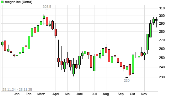 Mit dem Anstieg auf 297,00 EUR hat die Amgen-Aktie (ISIN US0311621009) am 27.11.2025 ein neues 6-Monats-Hoch erreicht und damit den Kurs vom 20.11.2025 eingestellt.