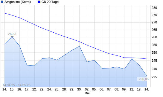 Mit dem Anstieg auf 246,65 EUR hat die Amgen-Aktie am 13.05.2025 die 20-Tage-Linie nach oben gekreuzt.