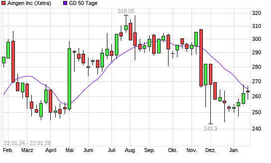 Mit dem Anstieg auf 262,95 EUR hat die Amgen-Aktie am 21.01.2025 die 50-Tage-Linie nach oben gekreuzt.