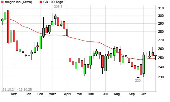 Mit dem Rücksetzer auf 248,40 EUR hat die Amgen-Aktie am 28.10.2025 die 100-Tage-Linie nach unten gekreuzt.