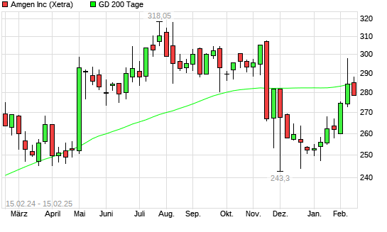 Mit dem Rücksetzer auf 280,00 EUR hat die Amgen-Aktie am 14.02.2025 die 200-Tage-Linie nach unten gekreuzt.