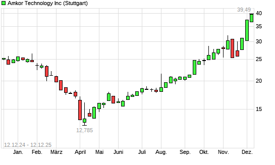 Mit dem Anstieg auf 39,01 EUR hat die Amkor-Aktie (ISIN US0316521006) am 11.12.2025 ein neues 12-Monats-Hoch erreicht und damit den Kurs vom 09.12.2025 eingestellt.