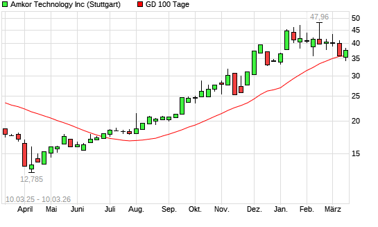 Mit dem Rücksetzer auf 35,07 EUR hat die Amkor-Aktie am 09.03.2026 die 100-Tage-Linie nach unten gekreuzt.